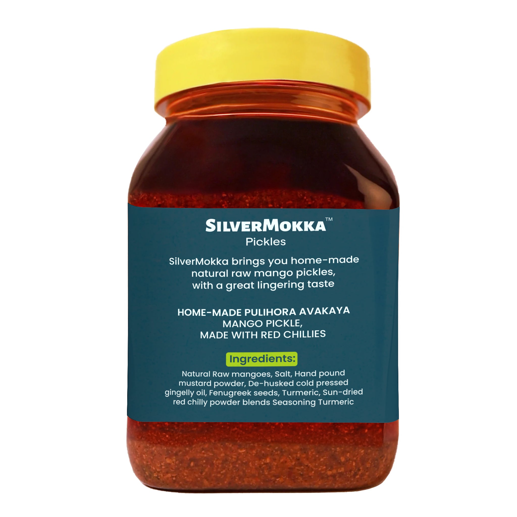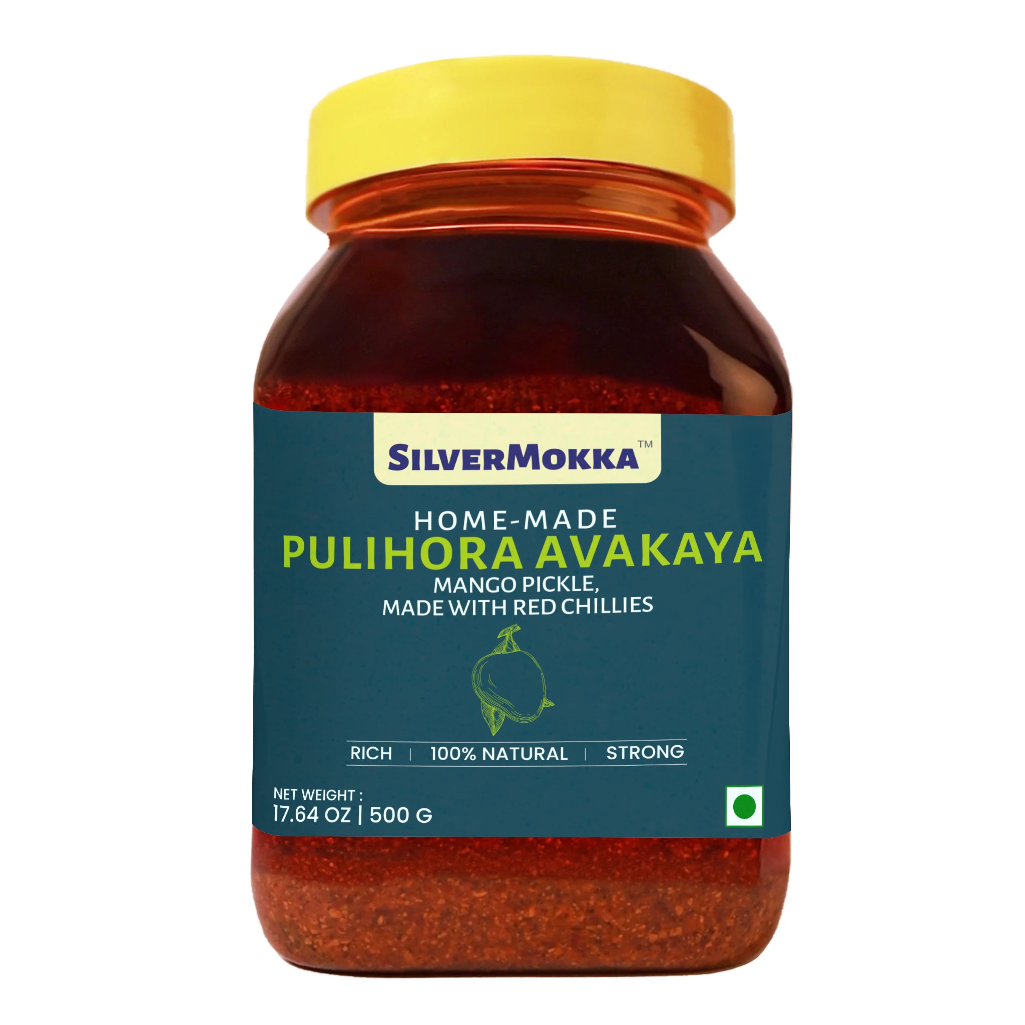 Experience the rich culinary heritage of Traditional Andhra mango pickles - our MokkaFarms Pulihora Avakaya Pickle is a hand-made art passed down through generations. Pulihora (Lemon Rice) Avakaya Pickle is made with Natural raw mangoes, De-husked Cold pressed gingelly oil, Sun-dried Red Chilli powder blends among other simple and natural ingredients. Enjoy our Paccha Avakaya Pickle with a wide range of dishes like Rice/ Lemon Rice, Roti/ Parantha, Dosa/ Cheela, Poha, Dal, Mathis/ Pakodis, Wraps, Curries, Sandwiches and more. Packed and sealed to ensure its delivered to you in the freshest way. Free from preservatives and chemicals. Store in a cool, dry place. Avoid refrigeration and the use of a wet spoon. Use a dry teaspoon to serve and seal tightly after use.