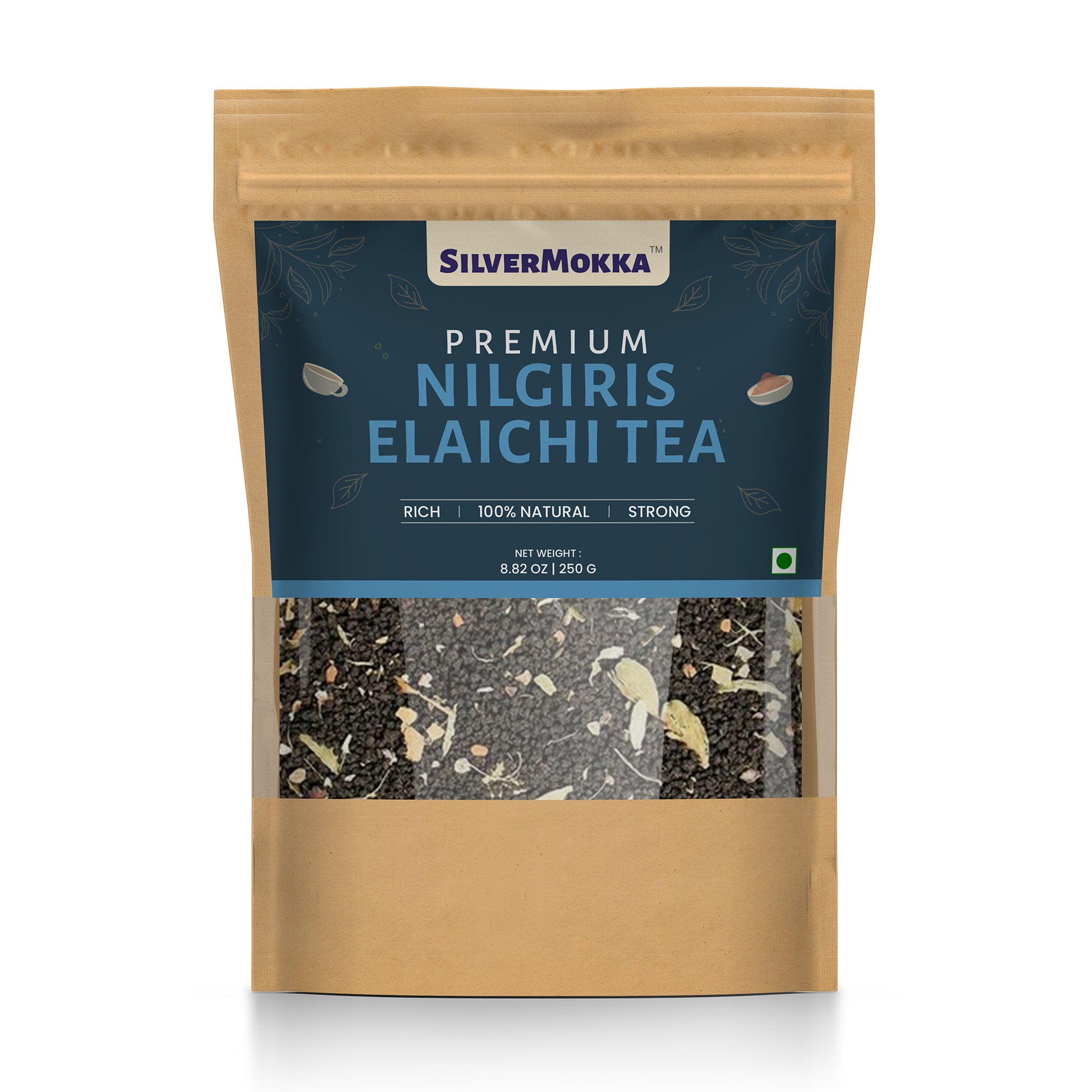 Experience the perfect fusion of bold Nilgiri CTC tea and the warm, fragrant notes of natural cardamom. SilverMokka Premium CTC Elaichi Tea is sourced from the pristine tea estates of the Nilgiris, offering a rich, full-bodied brew infused with the sweet-spicy essence of real cardamom pods.