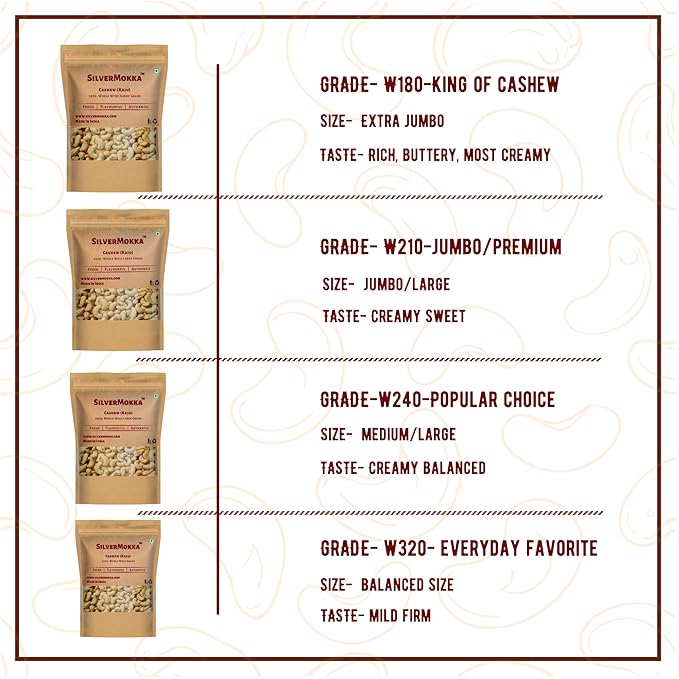 • Jumbo SIZE: Jumbo sized cashew nuts, with approximately 180 pieces per pound weight.
